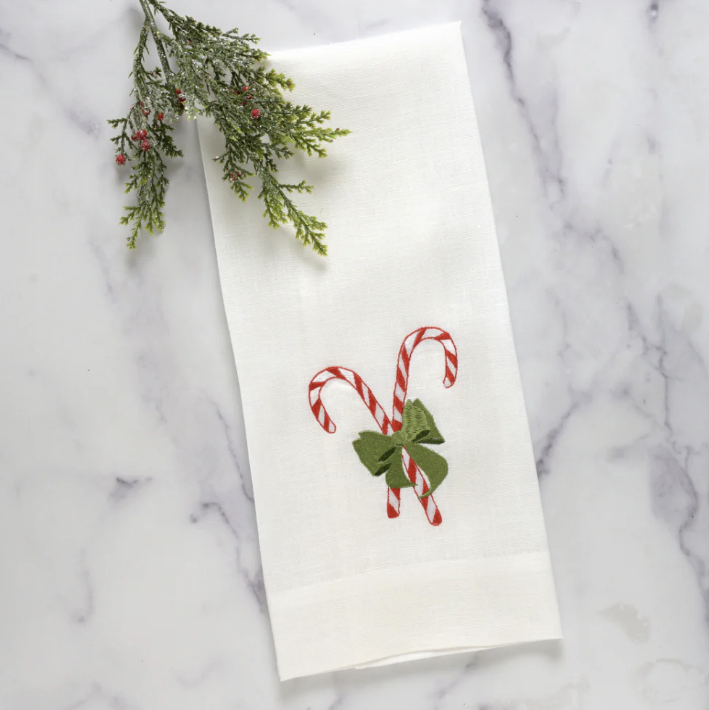 Canvas tote bag that holds an embroidered linen tea towel and a set of 8 shatterproof/reusable 16 oz. cups